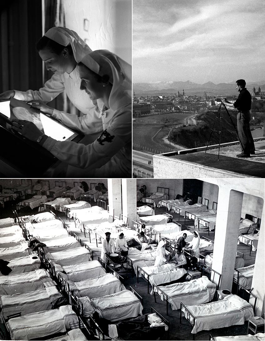 En su itinerario –sin duda asesorado– transitó por todas las dependencias retratando la complejidad y laboriosidad de los diferentes servicios que conformaban el centro. Las imágenes transmiten una sensación de orden, limpieza e intenso dinamismo. En la mayoría destaca el protagonismo femenino: enfermeras realizando curas, vendajes o anotando las indicaciones del médico; farmacéuticas elaborando medicamentos; técnicas realizando o revelando radiografías; costureras reparando y planchando la ropa de cama y de los heridos; las cocineras en plena actividad; las voluntarias de las oficinas elaborando fichas y registros…