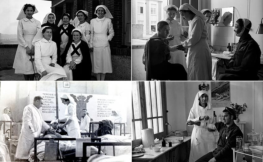En un tono más intimista encontramos también preciosos primeros planos de jóvenes voluntarias en plena labor asistencial: enfermeras vendando la cabeza de un soldado, sirviéndole un vaso de agua o acomodándole en la cama; oficinistas mecanografiando documentos; costureras concentradas en su máquina de coser; o auxiliares, primero tendiendo y después enrollando las vendas limpias para un nuevo uso.
