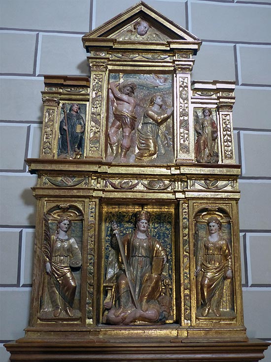 Revaloriza este retablo una bella policromía del manierismo fantástico con generosidad en el dorado bruñido y plateado en la espada, alfanje y tenazas. Entre las labores esgrafiadas vemos fondos rajados con arreboles, concentrándose las ordenanzas de grutescos de más calidad en el fondo azurita de la caja de santa Catalina. Se representa seriada una psicomaquia o lucha de antagonistas entre un muchacho desnudo con detallado estudio anatómico y un ave fantástica para evitar que se acerque a un jarrón repleto de frutos de la virtud. En las cenefas de los mantos de las tres santas del primer cuerpo, y especialmente en el envés del de la titular, se simulan morescos que copian patrones de bordados y ornamentos similares a los de F. Pellegrino (1530) o J. A. du Cerceau (1545).