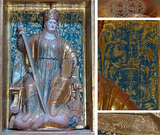 Talla de Santa Catalina. Detalles esgrafiados con grutescos y morescos.