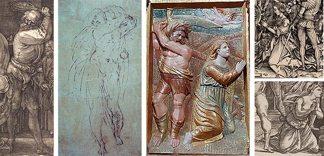 Fotomontaje de la decapitación de santa Catalina. A. Durero. Sayón de una flagelación. Miguel Ángel. Esclavo. Cámara secreta de la Capilla Medici. A Durero y D. Campagnola. Martirios de santa Catalina.