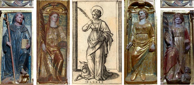 Fotomontaje con san Benito, santa Lucía, santa Apolonia y santa Margarita. M. Raimondi. Santa Inés.