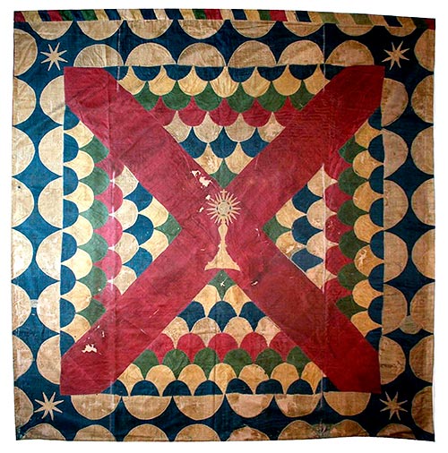 Intentando entender esta disparidad, hemos localizado en el Museo Sorolla una bandera con número de inventario 60273 muy similar a la mostrada en el óleo. Su ficha nos informa que está realizada en seda con ligamiento de tafetán con unas dimensiones de 2,09 metros de ancho por 2,10 metros de largo (figura 2). Su parte central está ocupada por una gran cruz en aspa de color rojo que, en el cruce de los brazos, presenta una custodia de color amarillo muy desvaído. El fondo muestra ocho hileras concéntricas de “escamas” de diferentes colores; del exterior al interior: azul, amarillo, verde, rojo, blanco, azul, amarillo y verde. El exterior lo forma una gran franja con escamas blancas enfrentadas sobre fondo azul y las cuatro esquinas ofrecen sendas estrellas blancas de ocho puntas. La vaina o borde por donde se sujeta al mástil presenta una serie de pequeñas franjas de los mismos colores que las escamas del fondo. Según los técnicos del museo, la pieza fue adquirida por Sorolla en su estancia en la villa de Roncal en el verano de 1912. ¿Por qué usó esta bandera para el panel de Nueva York en vez de la bandera municipal de Roncal que, como hemos visto, también conoció? La presencia de esta enseña en la propia casa-estudio del pintor seguramente indujo al artista a usarla en su obra definitiva sobre Navarra en vez de utilizar la enseña de Roncal, de la que solo tenía las fotografías o el óleo comentado.