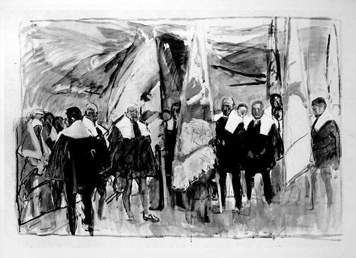 Un magnífico dibujo conservado en la Hispanic Society (Accession Number: A1526) (figura 3) nos ilustra cómo pudo ser la primera idea que tuvo el pintor para el panel navarro. En el dibujo vemos un buen número de varones sosteniendo grandes banderas apoyadas con el mástil en el suelo. Se ha especulado mucho con el acontecimiento que Sorolla representó en el panel de Navarra. Algunos autores proponen que la festividad de la Virgen del Castillo, otros que su octava, otros que el tributo de las tres vacas. La presencia en el dibujo preparatorio que comentamos de un gran número de banderas y varones vestidos de gala me induce a pensar que se trata de alguna junta general del valle. Precisamente el 24 de agosto se celebra la “Junta de San Bartolomé”, una de las tres juntas ordinarias prescritas en las ordenanzas del valle desde el siglo XVI, en la que terminaba el vedado de panificados y el ganado podía pastar en los campos ya segados. Es preceptivo que la junta sea en Urzainqui. Si Sorolla estuvo en Roncal entre el 21 y 29 de agosto, bien pudo asistir a esta reunión e inspirarle el panel de Nueva York.