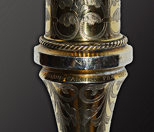 Gracias al citado número de La Avalancha, podemos saber que el báculo fue confeccionado en Lyon. Sin embargo, es la propia pieza la que concreta un poco más su procedencia, pues en el anillo que remata el cono sobre el que el báculo apoya en el suelo se puede leer: “ARMAND-CALLIAT FILS ORFÈVRE A LYON” (Armand-Calliat Hijo, platero en Lyon). De este modo, el báculo se puede vincular a la producción de Joseph Armand-Calliat (1862-1938), hijo del también orfebre y platero Thomas-Joseph Armand-Calliat (1822-1901). Formado en la Escuela de Bellas Artes de Lyon y en el taller de Gourguillon, en 1891 se asoció con su padre en el taller de orfebrería que este regentaba en la ciudad lionesa (Berthod et al., 2015, 84). El origen de este taller se encontraba en el matrimonio formado en 1853 entre Thomas-Joseph Armand y Jeanne Calliat. Esta última había heredado de su padre un taller de platería del que se hizo cargo Thomas-Joseph en compañía de su mujer y su cuñada, rebautizándolo con el nombre de las dos familias: Armand-Calliat (Berthod et al., 2015, 80).