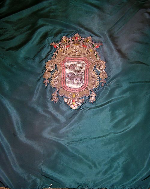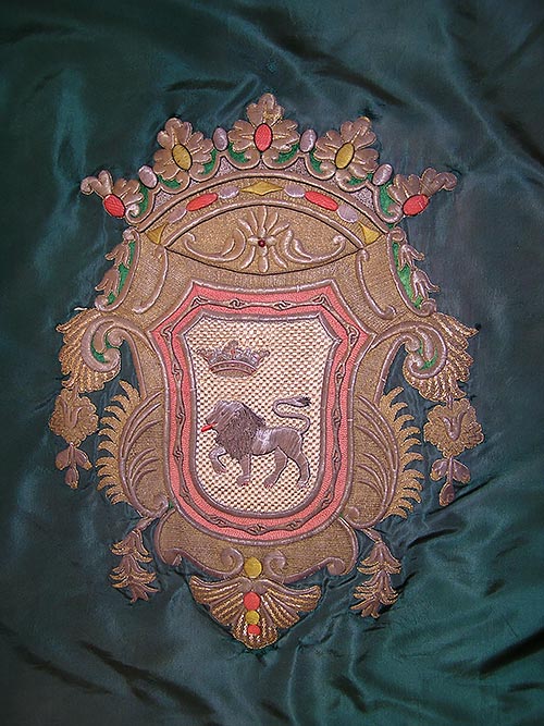 El hilo de oro amarillo y el oro viejo se combinan en las distintas técnicas de puntos de oro, alternándose las zonas bordadas en oro picado –técnica por la cual el hilo recorre el anverso y reverso del motivo creando una superficie lisa, en este caso sobre cierto relieve–, con las diversas variantes del oro llano como la hojuela o los setillos, el bordado de canutillo o la labor de cordoncillo de oro delimitando algunos contornos. La zona que rodea el escudo está realizada mediante un entramado de hilo de oro y seda amarilla, mientras que el fondo del mismo conforma un dibujo de ajedrezado a base de seda color crema y pequeñas puntadas casi imperceptibles de azul. El león, por su parte, está bordado al picado en plata sobre una base de cartón y su melena está elaborada con cordoncillo de plata. Al hilo de seda de colores lo encontramos, además de en conjunción con el hilo metálico, formando por medio del punto liso sobre una labor de empasillado, las piedras de la corona amarillas y rojas a modo de bodoques. Los distintos puntos utilizados y los realces de algunas zonas que se asientan sobre una preparación en basto crean diversos efectos de volumen y modelado, así como zonas más mates y otras más brillantes, según la incidencia de la luz en ellas. El conjunto se remata con una piedra roja engarzada en la parte superior del escudo.