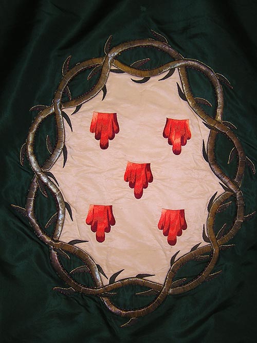 En la parte dorsal de la bandera, se representa, también en su zona central, el reverso de las armas de la ciudad de Pamplona (52 x 43 cm): las cinco llagas sangrantes que Jesús recibió en su martirio en la cruz, rodeadas por la corona de espinas, y que hacen alusión al voto solemne que en 1599 realizó el regimiento al librarse de una epidemia de peste. De esta manera, sobre un fondo de raso blanco, aparecen las cinco llagas bordadas al pasado en seda carmesí mediante punto de matiz o sedas de matices, que va creando una graduación de diversas tonalidades. Por otro lado, la corona de espinas que rodea el escudo está confeccionada con hilo entorchado de plata sobredorada que se aplica al picado sobre una superficie con cierto relieve.