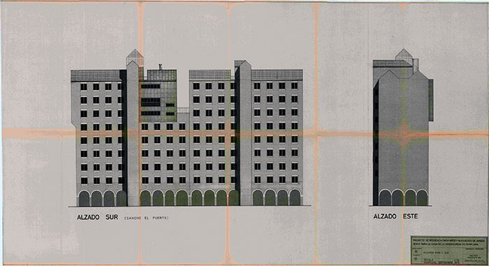La primera es la adaptación al paisaje circundante, ya sea rural o urbano, sin producir rupturas bruscas. En este caso se trata de un vasto edificio de planta baja y ocho alturas en forma de paralelepípedo, que se integra visual y volumétricamente con el barrio de Iturrama. La construcción más cercana son las torres de Huarte, de sus amigos Fernando Redón y Javier Guibert, a las que se asemeja con su alzado seriado de ventanas, de una severidad racionalista que solo queda rota por la efectista disposición del club en los últimos pisos y por las cajas de las escaleras. La residencia se sitúa en eje con las construcciones previas (frontón y pabellones), pero no dialoga con la arquitectura de Víctor Eusa. De hecho, la Junta de la Misericordia deseaba un edificio que no se pareciera a lo existente y una de las condiciones del concurso exigía que lo proyectado estuviese separado físicamente de la residencia de ancianos.