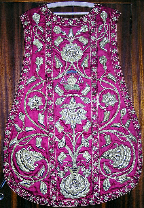 Además de los datos expuestos, este conjunto sí aparece recogido en los diferentes libros de los inventarios de la sacristía y así encontramos, entre los ornamentos encarnados, un terno “bordado en oro de Filipinas, conteniendo lo siguiente: casulla con estola y manípulo, velo y bolsa de cáliz; dos dalmáticas con estola y manípulos, ambas con sus collares; paño de atril y de hombros y tres manguillos para cruz procesional y ciriales, una capa pluvial correspondiente a este terno de oro”.