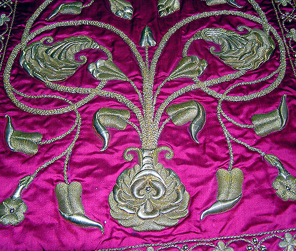 Técnicamente, destaca el gran relieve que alcanzan algunos de los motivos bordados. Estos, configurados con una importante preparación en basto, aparecen conformados alternando distintos procedimientos de oro llano y el oro picado. El oro llano, también llamado ‘oro tendido’ y ‘oro atravesado’, consiste en cubrir la superficie a bordar con una serie paralela de hilos metálicos que se sujetan al lienzo con unas pequeñas puntadas de seda amarilla o anaranjada que resultan casi imperceptibles. La colocación horizontal o vertical de los hilos de oro y la disposición de las puntadas de seda permite lograr diversos diseños y dibujos geométricos. Por otro lado, en el oro picado el hilo va cubriendo alternativamente el anverso y reverso del tejido, en este caso al realce. La alternancia de las dos técnicas provoca, junto al relieve de los motivos, una combinación de diferentes texturas y una gran cantidad de efectos de brillo y luz. Esto se ve acentuado, en algunos casos, con algunas tachuelas y lentejuelas de oro.