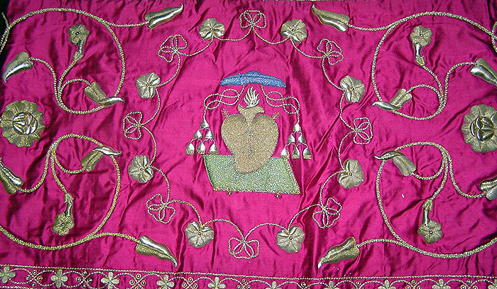 Asimismo, aunque no aparece referenciado en los inventarios como una de las piezas de este conjunto, existe en el convento un manto (176 x 88 cm) y vestido (89 x 76 cm) de raso carmesí de la Virgen Blanca cuya decoración bordada en oro recuerda a la que ostentan las diferentes prendas del terno que nos ocupa. De hecho, aunque la tela de fondo es propia del siglo XX, los bordados que porta son anteriores. Según documentación conservada en el convento, sabemos que en 1950 las Agustinas Recoletas de Pamplona hicieron dos mantos, uno de ellos rojo, entresacando la decoración bordada de otros mantos y piezas de la sacristía, lo que puede indicar que en origen este conjunto contara también con un manto para la imagen mariana del convento.