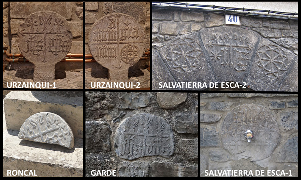 Los monogramas utilizados en estas estelas son invocaciones al nombre de Jesús en latín (IHS) y griego (XPS); en ambos casos utilizando las dos primeras y la última letra de su nombre Ih(esu)s en latín o Χρ(ιστο)ς “Chr(isto)s” en griego. Los dos monogramas han sido usados desde el siglo IV como símbolos protectores. En el valle de Roncal proliferan en las claves de muchas puertas de acceso a las casas. Los propios autores del artículo citado mencionan a este respecto que “Hay una extensa zona de Navarra, que abarca los valles de Roncal y Salazar, Navascués, Romanzado, Urraúl Bajo y Alto, Lumbier, Sangüesa, Valles de Aibar y Orba y una prolongación del Partido de Aoiz hacia el oeste, con una gran densidad de monogramas de Jesús”. La presencia de estas seis piezas en un área tan próxima nos induce a proponer la presencia de un taller de cantería de cierta entidad en esta zona con importantes conocimientos de su oficio. Taller que por la epigrafia usada y el tipo de piezas trabajadas, podemos datar a finales del siglo XV o principios del XVI.