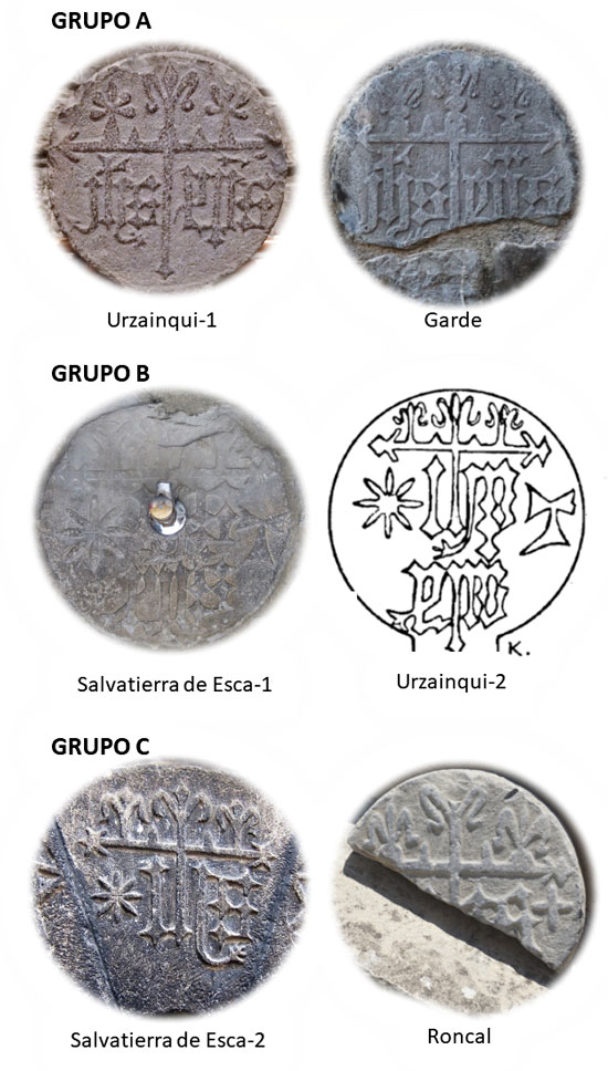 Los tres grupos que hemos descrito muestran detalles coincidentes sorprendentes. Así, en las estelas del grupo A, el brazo corto de la cruz acaba en una punta en forma de V muy diferente a la terminación de las cuatro piezas del grupo B y C. Presentan también lo que probablemente sea un signo de abreviatura encima de la P del anagrama XPS que no aparece en los otros dos ejemplares del grupo B. Las dos estelas del grupo A muestran el anagrama JHS con J en vez de I usada en el resto de las piezas. Además, la H de este grupo exhibe un palo cruzado sobre el trazo ascendente de la letra que no vemos en el resto. Por último, este grupo carece de la estrella de ocho puntas que encontramos en los otros. Por otro lado, el grupo B presenta un punto sobre la letra S del monograma XPS, posible señal de abreviatura, que no aparece en el grupo A. Así mismo, estas estelas terminan la H en una rama que gira hacia la izquierda, giro que en el resto de piezas es hacia la derecha. Por último, muestran a la derecha del anagrama IHS una tau que solo la encontramos en estos ejemplares. Desgraciadamente, la fragmentación de la estela Roncal hace difícil la comparación de los ejemplares del grupo C.