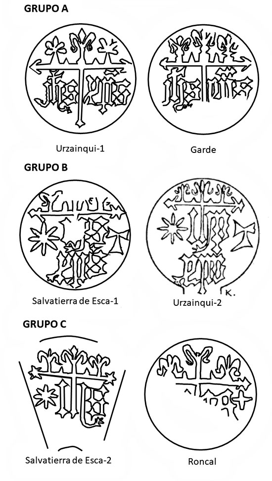 A pesar de la gran homogeneidad de las seis piezas, las podemos agrupar en tres parejas según el número y posición de los monogramas cristológicos que contienen. Los hemos denominado grupo A, B y C, y son prácticamente iguales. El grupo A expone los monogramas colocados uno a cada lado de la cruz, debajo del brazo corto. El epígrafe JHP en la izquierda y XPS en la derecha. Pertenecen a este grupo las estelas Urzainqui-1 y Garde. El grupo B también presenta los dos monogramas, pero colocados uno debajo del otro. El superior IHS hace coincidir el palo de la H con el brazo largo de la cruz. Pertenecen a este grupo las estelas Salvatierra-1 y Urzainqui-2. El grupo C solo muestra el monograma JHS, carecen del monograma XPS. Pertenecen a este grupo la clave Salvatierra-2 y la estela Roncal.