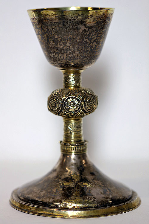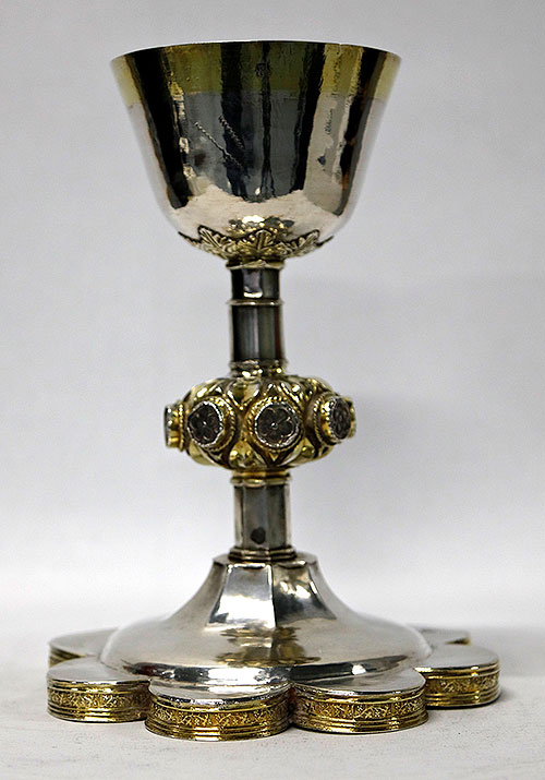 El primero de ellos, realizado en plata en su color y dorada, presenta una base de perfil troncocónico, con zócalo esvasado entre molduras rectas, seguido de un cuerpo acucharado que da paso al astil cilíndrico, con nudo de manzana con besantes circulares alternos con hojas de cardo, y copa acampanada. Como suele ser habitual en el centro de Pamplona, se trata de una pieza de gran sencillez, donde prima la estructura arquitectónica de la obra, que presenta una sobria decoración compuesta por una cenefa almenada que separa la parte superior de la base del astil, y diferentes elementos vegetales: roleos en el astil, flores de cinco pétalos en los besantes y las hojas de cardo de la manzana, que se completa con la figura incisa de una cruz sobre rocas en la base.