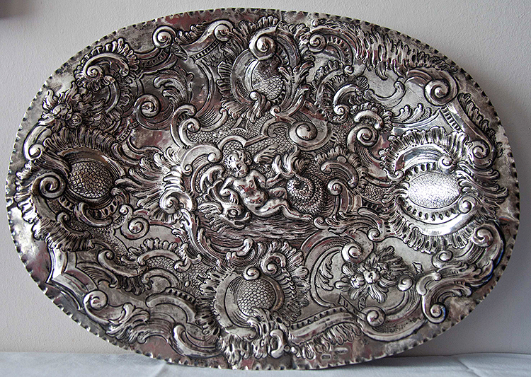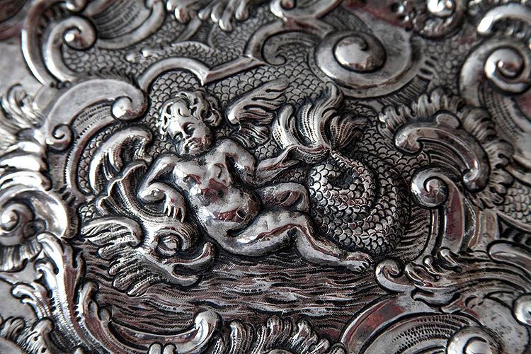 En el emblema se dispone una escena de un putto, de carnosa anatomía, recostado sobre un delfín, con la cabeza vuelta hacía el putto y la cola enroscada sobre sí misma. Se trata de un motivo mitológico de carácter frívolo que sigue la tradición de ángeles y putti en actitudes lúdicas con humanos y animales, en la línea de la escultura romana que posteriormente recupera el Barroco. En la iglesia de Santa María de Tafalla, en Navarra, se conserva un azafate de autor desconocido, ya que que no presenta marcas, y más avanzado en el tiempo, en el que vemos el mismo motivo que en el aquí estudiado, un putto recostado sobre un delfín, pero con diferente tratamiento plástico en cuanto a la representación de las figuras. Las escenas de putti en diferentes actitudes y acompañados tanto de figuras humanas como animales resulta recurrente en los azafates de la época, como podemos comprobar por los ejemplares conservados de diferentes talleres peninsulares. Así, nos encontramos putti en un azafate de la iglesia de la Magdalena de Zaragoza, obra de Diego Lacasa; en el azafate de colección particular labrado por Miguel de Lenzano, cuyo motivo repetirá en su examen para obtener el título de maestro su discípulo Lorenzo Laoz; y en los de los conventos de Segura, en Guipúzcoa, y Tulebras, en Navarra, todos ellos labrados por plateros de Pamplona.
