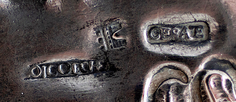 Esta pieza presenta la triple marca empleada en Zaragoza: localidad, contraste y autor. La primera, CESATE, con la T y la E fundidas, se corresponde con la variante de punzón de Zaragoza vigente en la ciudad en la segunda mitad del siglo XVIII. La segunda, un castillo, fue el punzón utilizado por los contrastes de Zaragoza entre 1770 y 1790. Y la tercera, GOICOECHEA, corresponde al platero zaragozano Andrés Goicoechea, maestro vecino de Zaragoza al que se tiene documentado en 1776 trabajando para la iglesia de Nuestra Señora del Portillo de la ciudad, para la que renovó una lámpara vieja y realizó otra de nueva factura. Con este platero estuvo como aprendiz durante cerca de cuatro meses el artífice Alejandro Pastor, natural de Teruel, quien, tras pasar por los talleres de diferentes plateros zaragozanos, se trasladó a Pamplona, donde se formó con Miguel de Lenzano y Pedro de Aguinagalde, hasta que se examinó en 1776, precisamente con el dibujo de un azafate.