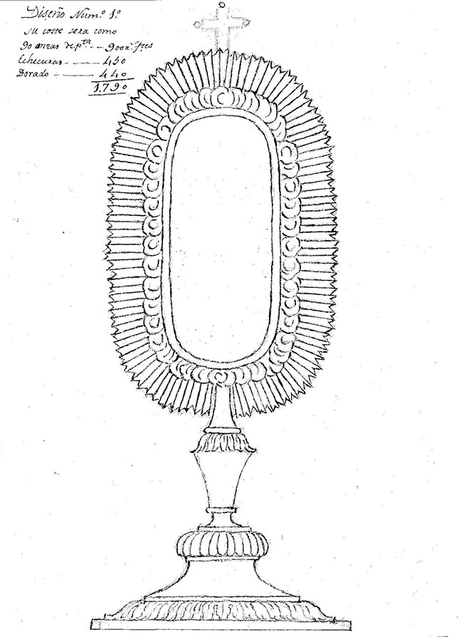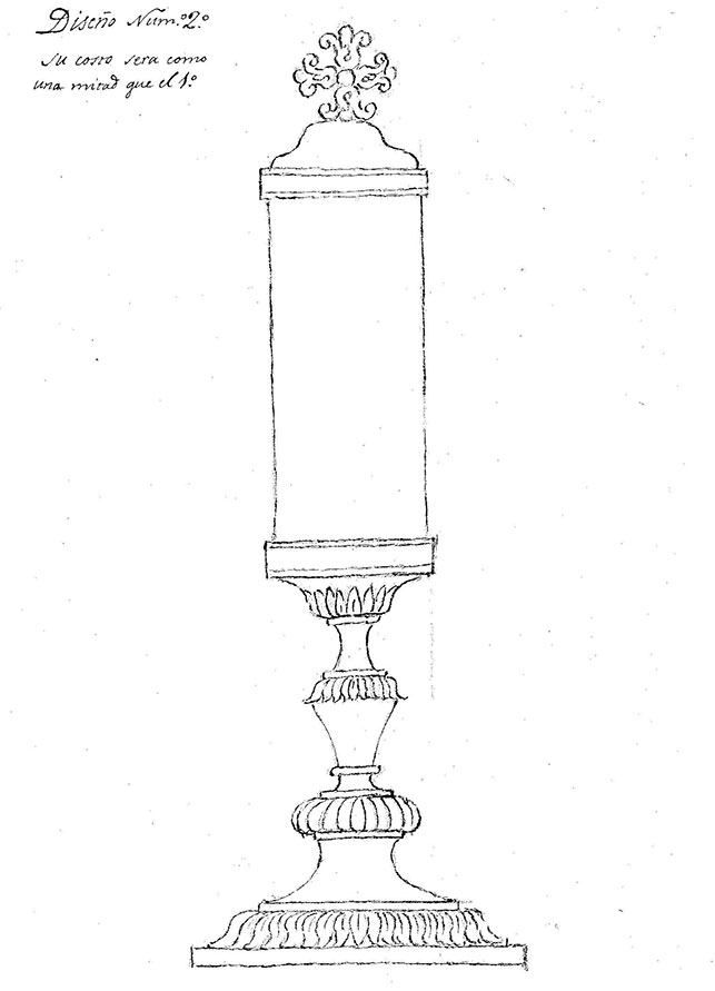 La segunda opción, mucho más simple (fig. 2), se reduciría a una peana de unas características similares al soporte de la primera de la que partiría un tubo de cristal que albergaría las reliquias y que remataría, al igual que la anterior, en una cruz. La mencionada misiva rubricada por Ignacio R. Fernández iba acompañada de sendos dibujos de los mencionados diseños en cuyos márgenes aparecía, también, desglosado el montante que el cabildo calagurritano debía desembolsar en caso de que se decidiesen a contratar la obra. En la primera opción la cifra ascendía a los 1790 reales de vellón, total que se rebajaría hasta los 880 reales en el caso de que se hiciese sin dorar, según indica la carta. El segundo diseño, como señala el propio dibujo, costaría la mitad que el primero; es decir, 895 reales de vellón. Los dibujos de ambos diseños cuentan con unas medidas de 30,5 cm x 21 cm y están realizados sobre papel y a plumilla, habiéndose utilizado en su ejecución el compás y la mano alzada. Es necesario en este punto dedicar algunas palabras al referido autor de los dibujos. Pedro Antonio Sasa (1745-1831), natural de Logroño, pasó a residir en Pamplona, donde aprendió el oficio junto con Fernando Yabar para, posteriormente, casarse con su sobrina. Sobre él conocemos que se examinó en agosto y octubre de 1775, que fue un platero muy prolífico y que sus obras se extienden por todo el territorio del Antiguo Reyno (Fernández Gracia, 2020, p. 31). Volviendo al proyecto de ejecución de los relicarios que nos reúne, se debe señalar que, a la luz de la documentación analizada para la realización de este estudio y teniendo en cuenta los hechos que se sucedieron a partir de 1822, parece que el cabildo catedralicio de Calahorra nunca se decidió por ninguna de las dos opciones y que en consecuencia no se ejecutó ninguno de los proyectos; o al menos no se han conseguido evidencias documentales o materiales que demuestren lo contrario.