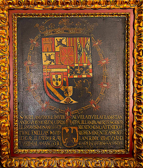 Anónimo. Escudo de armas de la Monarquía de España con el escudo de Villafranca integrado. Ca. 1680. Ayuntamiento de Villafranca