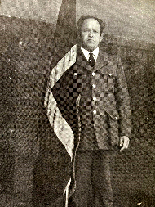 Javier Peralta Rudi, alguacil, con la bandera antigua de la cofradía. Año 1983. Colección particular