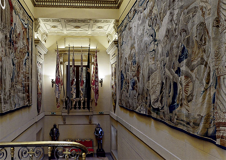 Banderas de distintos municipios en la escalera de la Diputación Foral de Navarra. ©Gobierno de Navarra