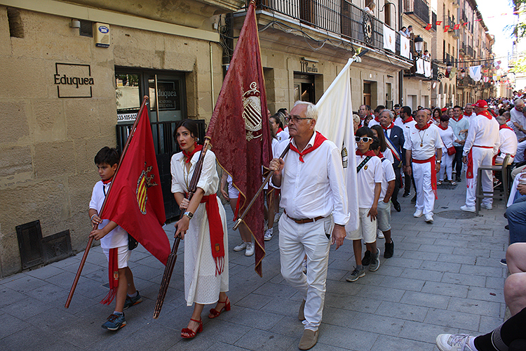 Abanderados de Viana y La Brède hacia la misa de Santa María Magdalena, 22, julio, 2024. Foto: F. Cariñanos.