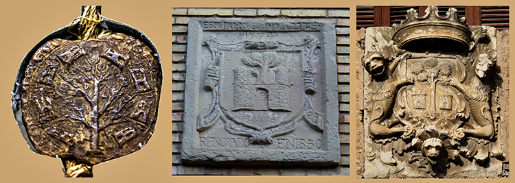 Las villas se dotan de unos elementos que sirvan de divisa, que los representen y con los que se identifiquen. Esta función cumple el escudo del Concejo, del conjunto de vecinos, como atributo colectivo. De época medieval nos ha llegado el emblema en los sellos céreos (1255) utilizados en los pergaminos que validaban los acuerdos y representaban a la villa. Es de suponer que el emblema también figurara en el pendón o bandera del Concejo: Un olivo con fruto, una estrella a cada lado de la base del tronco y ocho torres por orla.