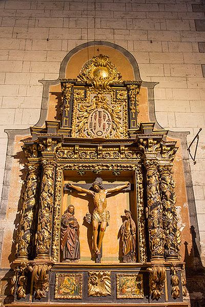 El retablo mayor queda complementado artística, simbólica y litúrgicamente por ocho retablos colaterales levantados a lo largo de los siglos XVII y XVIII. El más antiguo data de la primera mitad del siglo XVII y corresponde al retablo de las Ánimas que acoge lienzos de carácter popular enmarcados en una arquitectura depurada. El resto de retablos corresponden a los años finales del siglo XVII y al siglo XVIII. De hacia 1670 data el retablo del Sagrado Corazón retocado sobre 1760 con decoración rococó. Entre fechas similares se pude situar el bello retablo de San José con una caprichosa decoración rococó añadida en 1763 por Pedro Labarrera. También de hacia fines del XVII sobresalen los retablos del Rosario, el de la Vera Cruz, con un Calvario gótico hispano-flamenco de gran calidad. En el siglo XVIII se levantaron los retablos de la Inmaculada, que alberga una hermosa imagen de candelero de la Virgen, del Pilar y de la Dolorosa. Destaca este último en el que se alberga un hermoso Cristo yacente articulado seguramente empleado en la función del Descendimiento.