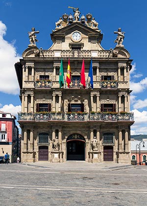 La casa consistorial de Pamplona, de la que solo se conserva la fachada, fue la más monumental de las que se erigieron en Navarra durante la Modernidad, algo natural si se atiende a su condición de capital del Viejo Reino. Vino a sustituir a la antigua casa de la Jurería, edificada a raíz del Privilegio de la Unión (1423), que a mediados del siglo XVIII amenazaba ruina. Su construcción se prolongó durante siete años (1753-1759), siguiendo las trazas de Juan Miguel de Goyeneta salvo en la fachada, que fue diseñada por José Zay Lorda y se remató con un coronamiento del maestro Juan Lorenzo Catalán.