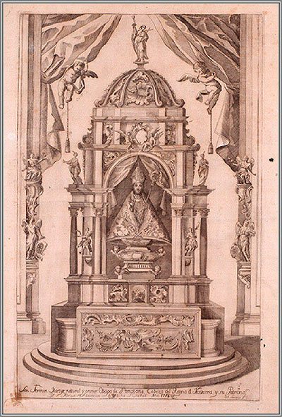 El trono o templete, inicialmente construido para cobijar la imagen de San Fermín, fue desmontado y retirado de su emplazamiento bajo el cimborrio en 1793, cuando la cúpula de la Capilla evidenció filtraciones y serios daños por humedad. A partir de ese momento se perdió su rastro. Pero es posible reconstruir una imagen ideal aproximada, mediante documentación coetánea y por medio de algún testimonio figurativo conservado: es el caso del grabado aquí reproducido, debido al buril del aragonés José Lamarca, abierto a devoción por el Regimiento de Pamplona y, cuando menos, reimpreso en 1765. Fue autor del trono-tabernáculo Pedro Onofre Descoll, un escultor activo en Aragón y Navarra en las postrimerías del siglo XVII y durante el primer tercio del XVIII, con taller abierto en Zaragoza, quien cuenta con obra documentada, aunque en buena parte desaparecida. En cuanto al trono, señalaremos que se alzaba sobre graderío circular de tres escalones, de piedra procedente de Ablitas. Su planta cuadrada, que presentaba cuatro vanos de unos siete metros de altura, rematados en arco, dando cara a las cuatro naves de la cruz griega articuladora de la Capilla, al ascender evolucionaba al ochavo; y, finalmente, culminaba con una cúpula rematada por pequeña linterna. En los frentes del zócalo cuadrangular, de alabastro bruñido, se integraban otros tantos altares, sólo uno de finalidad cultual -con sagrario-, y tres, para guardar con él simétrica correspondencia. Profusamente decorado con molduras y motivos vegetales de flores y frutas, incluía un extenso programa iconográfico, con representaciones en bulto de Virtudes, ángeles y una Fama, en el remate, pregonera de las glorias de San Fermín. Su interior fue dorado por José García, el mismo maestro que había dorado las tribunas barrocas del recinto, hoy desaparecidas. Las grandes proporciones del artefacto, casi siete metros de anchura (26 pies) y, sobre todo, los diecisiete de altura (65 pies), le permitían competir con la magnitud del frontispicio de entrada a la Capilla. El carácter escenográfico del trono se veía realzado por un pavimento de azulejos de colores, que se extendía ante sus cuatro caras, a modo de alfombras, bajo el claro de la cúpula.