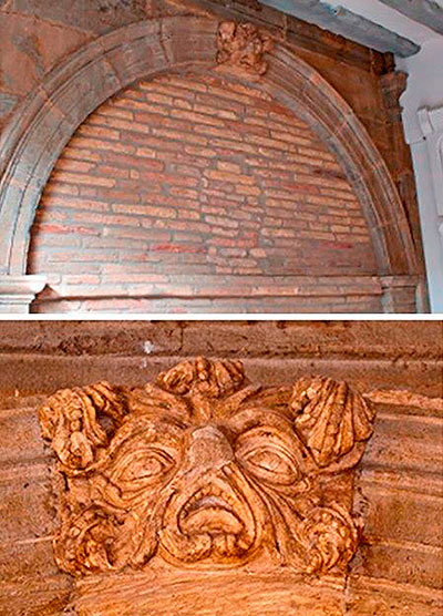 El arco recuperado en 2008 se muestra cegado mediante pared de ladrillo; y en ella se aprecia la marca de un antiguo óculo circular macizado y quizá también, la impronta de una ventana rectangular anterior (recordemos que los óculos se prodigaron en el edificio, con ocasión momento de la reforma debida a Ochandátegui de 1800 a 1805). La importancia del hallazgo estriba en el motivo plástico que exhibe la clave del arco como ornato: no otra cosa que la representación de un green man, tema bien conocido y de gran difusión en el tiempo, la geografía y las culturas; y que consiste en la representación de un rostro humano mediante el empleo combinado de elementos vegetales y anatómicos reales. La materia esculpida es una caliza de fácil labra, de tonalidad blanquecina, bien diferenciada en tono cromático de las dovelas grisáceas vecinas. Parece que la totalidad y cada uno de los arcos exteriores de la capilla dispuso de su correspondiente green man, esculpido en la respectiva clave. De hecho, hoy se aprecia el empleo de la misma piedra blanquecina para todas las dovelas centrales. Sin duda para el ideario arquitectónico de Ochandátegui resultó imprescindible depurar las arquerías de elementos anecdóticos de estirpe barroca, prescindiendo de máscaras sentidas como caricaturescas. Para ello se procedió a un raído de las claves mediante cincel, que permitió sin mayor complicación igualar su superficie con el decurso liso de las roscas. En la calle Mayor de Pamplona, entre 1709 y 1716 se terminaba la labra de la fachada del palacio de los marqueses de San Miguel de Aguayo, hasta hace poco conocido como colegio de Teresianas, edificio bien próximo a la Capilla de san Fermín, inaugurada en 1717. Precisamente en el dintel de esta portada palacial se aprecia la representación de un green man. La cercanía de ambas construcciones y su coincidencia temporal llevan a pensar que la repetición del mismo motivo plástico no es meramente casual.