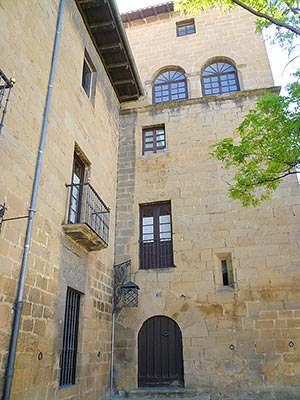 Adosada al ángulo noroeste de la fachada principal se sitúa, en escuadra con esta, una torre prismática de cantería que probablemente se construyó reutilizando una torre anterior de origen medieval, quizás perteneciente al sistema amurallado de Tafalla, por lo que seguramente cumplió en el primitivo edificio una función defensiva, adelantada con respecto a la línea amurallada de la ciudad. Con el paso del tiempo y siguiendo modelos castellanos, la torre fue incorporada a la función residencial de la casa, tal y como era habitual en este tipo de construcciones urbanas. Sin embargo, al contrario de lo que solía ser habitual, la incorporación no se hizo adosando un cuerpo cúbico en línea con la torre, sino que en este caso se ubicó a escuadra con la fachada.