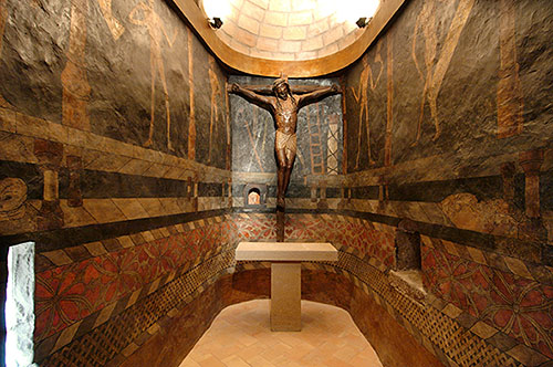 En la década de 1970 se levantaron la decoración y las pinturas barrocas de la capilla y se descubrieron los frescos originales. El Cristo está rodeado por un impresionante conjunto de pinturas murales tardogóticas. A sus lados tiene los atributos de la Pasión. En los muros laterales se representa la Danza de la Muerte, único ejemplo del tema conocido en España. Varios esqueletos plasman la supremacía de la muerte, la brevedad de la vida y la vanidad de las cosas mundanas. Aunque es un tema netamente medieval, se representa con algunos rasgos formales que anuncian la pintura renacentista, como la perspectiva del tablado que sustenta a las figuras o la presencia de balaustres.