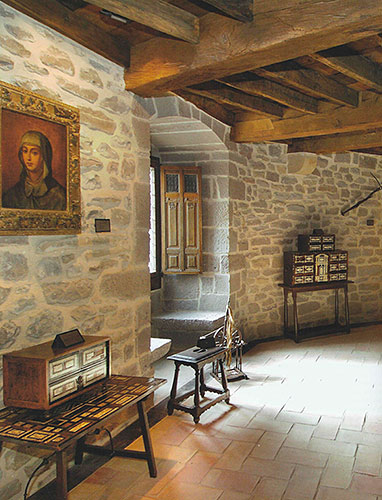 La ambientación actual corresponde a los siglos XVII y XVIII. En el centro, sendas mesas de nogal y de pino están rodeadas de sillones fraileros y sillas de nogal tachonadas de latón. Dos escritorios de nogal y ébano, del siglo XVII, con taraceas geométricas de hueso, recuerdan las funciones de gobierno y administración del señorío de Javier, mientras que una ballesta habla de las ocupaciones militares de sus señores. Del siglo XIX son una rueca que recuerda las tareas domésticas y el tedero que adorna la chimenea, único vestigio del fogón. La pieza más significativa de la decoración pictórica es un óleo de la Sagrada Familia, de escuela flamenca de la segunda mitad del siglo XVI. En el muro interior una alacena exhibe, junto a piezas de cerámica, biografías de san Francisco Javier impresas en diversos países europeos, algunas del siglo XVII, que demuestran la rápida expansión de la devoción al santo.