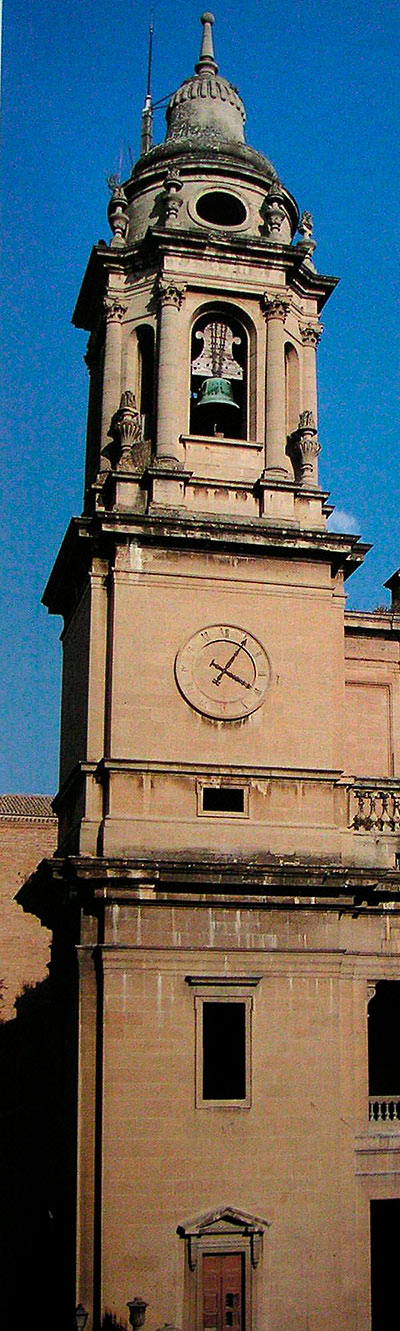 Ambas torres son robustas y macizas en la base, de planta cuadrada en el primer y segundo cuerpo, y ochavada en el tercero y último. El primer cuerpo se perfora con pequeños vanos, en el segundo se disponen relojes de torre y de sol -parejos con el rosetón del cuerpo central-, mientras que en el tercero columnas de orden corintio encuadran los arcos de medio punto destinados a las campanas. El remate campaniforme aparece rodeado de flameros. Los dos primeros cuerpos enlazarían con los aspectos de sobriedad, proporción y pureza volumétrica que los especialistas destacan en la fachada, mientras que el último, especialmente el remate, con sus caprichosas formas, se ha puesto en relación con el barroco a la romana que caracterizó las primeras obras de Ventura Rodríguez. La torre norte alberga, entre otras, la campana llamada María, fundida en 1584, de tal tamaño que se la considera la segunda de España por su peso y magnitud. Sólo es tañida en las grandes solemnidades, cuando llega a oírse en los pueblos de la Cuenca de Pamplona.