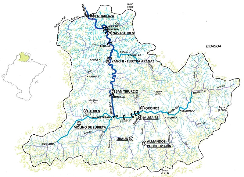 La cuenca más importante en cuanto a producción hidroeléctrica fue la del Bidasoa, una zona de condiciones propicias por sus precipitaciones abundantes y fuertes desniveles. En la década de 1930, allí se localizaba el 30 % de la capacidad instalada en Navarra, que era transferida en su práctica totalidad al mercado guipuzcoano. Las instalaciones de algunas de las principales empresas del sector –como Electra Puente Marín o Saltos del Bidasoa– se alimentaban del agua del Bidasoa y sus afluentes.