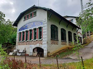 Más original es la fachada corta, presidida por un letrero cerámico modernista con el nombre de la sociedad propietaria y el año de inauguración en letras amarillas sobre fondo azul. Este letrero está delimitado por un arco escarzano de gran anchura formado por dovelas de almohadillado rústico, acabado que también se emplea para flanquear la fachada. Los vanos se distribuyen en dos pisos: una galería de seis altas y estrechas ventanas separadas por pilares de ladrillo rojo, sobre la que se apoya el frontón de decoración cerámica, y una galería cuatripartita de ventanas de formato cuadrado bajo el alero.