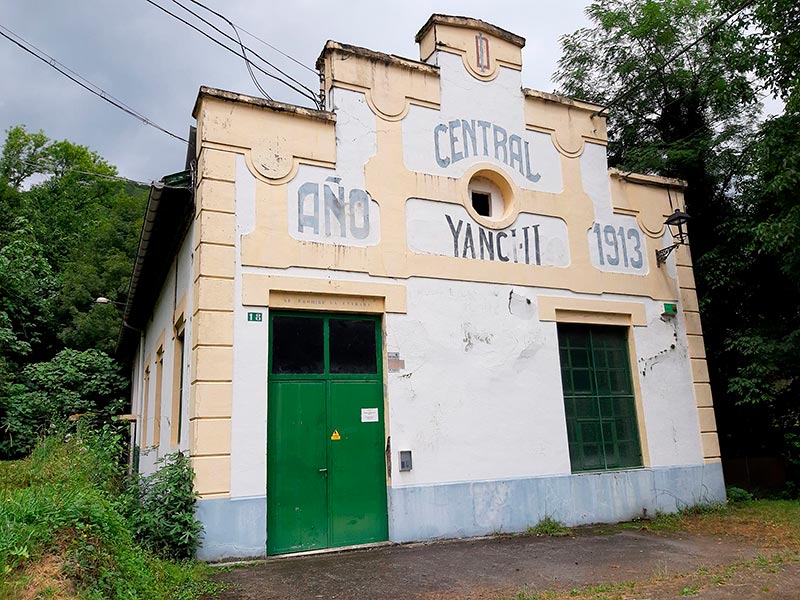 La casa de máquinas, que alberga dos grupos de generación, tiene una interesante fachada de marcado sentido ascensional, mediante la disposición de sillería simulada de refuerzo en las esquinas, bandas verticales en el muro y un remate escalonado. La parte superior de la fachada se resuelve con bandas verticales y horizontales en ligero resalte que encierran un óculo y la tipografía con el nombre de la empresa –originalmente Electra Aranaz– y el año de inauguración. Estos elementos se combinan con detalles ornamentales semicirculares que enriquecen los escalonamientos del remate. En la mitad inferior se disponen un portón y una ventana adintelados con coronamiento de sobria composición. La alternancia cromática contribuye a remarcar los diferentes elementos empleados en la articulación de la fachada.