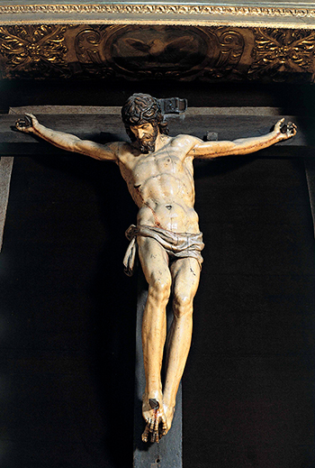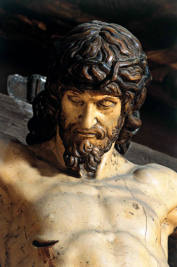 El magistral tratamiento anatómico de los planos musculares nos presenta el cuerpo atlético de un hombre de 33 años en su plenitud que, por su hiperrealismo, demanda más un estudio fisiopatológico que histórico-artístico. En lo que coincide plenamente con el crucificado de la catedral es en la representación de las manos semicerradas y contraídas por la acción de los clavos sobre el metatarso y el metacarpo, y del pie derecho montado sobre el izquierdo con la separación del dedo gordo en V. Se cubre con un paño de pureza mínimo o franja horizontal de tela anudada en su cadera diestra, que deja descubierto un desnudo apolíneo. La blandura de este cuerpo, tallado en un tronco de nogal, se obtuvo al finalizar la escultura en blanco, pero se revistió definitivamente con una epidermis gracias a la encarnación a pulimento que hizo del rey de armas Juan de Landa, que hubiera satisfecho plenamente a su autor Juan de Anchieta. Hasta en los finos hilillos de sangre y su recorrido sobre la piel se aprecia la maestría del pintor. Con este complemento, que todavía permanece, se dio a esta imagen de devoción, la última vida y expresión.