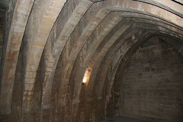 Uno de los elementos más sorprendentes del Palacio de Olite es la presencia de un jardincillo acondicionado en la planta noble, varios metros por encima de los demás jardines. Para conseguirlo, edificaron una impresionante secuencia de enormes arcos de piedra que descansan en los muros de la Torre Nueva y del recinto exterior, colocados muy juntos, de tal forma que fuese posible disponer losas de piedra de arco a arco. Sobre dichas losas extendieron la tierra del jardín. El jardincillo estaba enmarcado por cuatro galerías que conformaban una especie de claustro, por lo que la documentación medieval lo llama “la calostra”. El acceso se realizaba desde la Torre Nueva y desde los corredores anejos a los muros perimetrales del palacio, configurando así un espacio intermedio entre el núcleo residencial, formado por la Gran Torre y la Torre Nueva, y las torres exteriores emplazadas al sur del palacio. Ni que decir tiene que la estancia inferior, cubierta por los enormes arcos, quedo inutilizable por la ausencia de iluminación y por la humedad derivada del jardín. Con el paso de los siglos acabó siendo conocida como “sala de los murciélagos”.