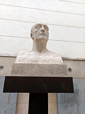 Fue, en efecto, Antonio Loperena Eseverri el autor del busto, artista de formación autodidacta que completó con el estudio en el taller pamplonés de Constantino Manzana y con diversos viajes por Italia, Egipto, México y Venezuela. Loperena desarrolló una amplia trayectoria con un estilo figurativo y realista, de profunda conexión con la tierra, sus oficios y tradiciones, prestando especial atención a la indumentaria y a la caracterización de los rostros en los que buscaba el retrato de “tipos” populares para lograr la emoción del espectador. Tiene obra religiosa, especialmente en iglesias de la Ribera navarra, y también destacan sus obras de carácter funerario, destinadas al ornato de panteones en cementerios. Pero sobre todo es autor de un conjunto de obras de carácter público en las que emplea mayoritariamente la piedra y el mármol.