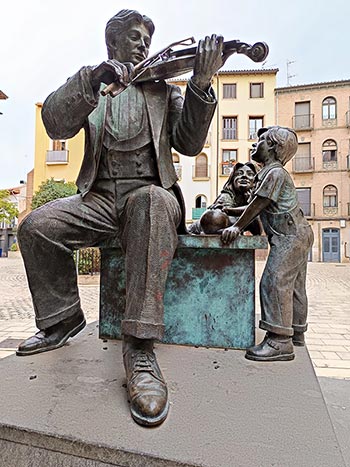 El conjunto, realizado en fundición de bronce a la cera perdida, tiene unas dimensiones de 1,20 metros de ancho, 1,70 de fondo y 1,70 de alto, y supera los 1.300 kg. de peso; y se eleva sobre un pedestal de hormigón de 1,10 metros de altura. Representa la figura de un violinista que, sentado en un banco, toca su instrumento ante la atenta mirada de unos niños que escuchan la melodía con semblante risueño. La interpretación es totalmente figurativa, de carácter naturalista y equilibrada; el violinista presenta una actitud de plena armonía y concentración en la ejecución de su música donde incluso los pequeños, interrumpiendo sus juegos con la pelota, han decidido prestarle atención y participar de la intimidad musical en la que está sumido el artista. El realismo detallado con el que Mauro Álvarez representa la postura del violinista, la expresión concentrada de su rostro y los gestos expectantes de los niños, evidencia tanto su maestría técnica como su capacidad para captar emociones. Se recrea en la multitud de detalles que componen el aderezo de un músico profesional de orquesta sinfónica el día de estreno; es más, va vestido con la elegancia de un concertino, a lo que se añade el perfecto conocimiento de la posición del músico cuando está ejecutando la pieza musical y el equilibrio del cuerpo, recursos a través de los cuales el escultor asturiano impregna de un aire romántico a toda la composición que no se muestra estática sino dinámica, con el violín en plena ejecución y la mirada atenta de los pequeños. Todo ello invita al espectador a participar de esa experiencia sensible.