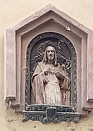 En la fachada de esta casa, a la altura del forjado de la primera planta se conserva un altorrelieve del Sagrado Corazón, enmarcado con una sencilla embocadura que penetra ligeramente en el muro. A partir de la publicación de la encíclica Annum Sacrum, con la que el papa León XIII consagraba el mundo al Sagrado Corazón, e incluso en los años anteriores, en muchas casas particulares se colocaron, tanto en la puerta de entrada como en las fachadas, placas con una imagen del Sagrado Corazón. Algunas de ellas se encuentran todavía en las calles de Casco Histórico de Pamplona, pero en ningún caso tienen la entidad y características de este altorrelieve que, por su forma, se asemeja a las tradicionales hornacinas del barrio.