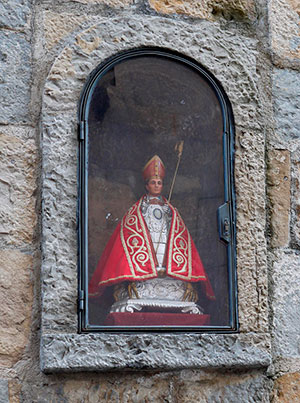 En la cuesta de Santo Domingo. La hornacina fue realizada en 1981 por encargo del Ayuntamiento, respondiendo así a la petición que hizo la subcomisión del encierro en la Comisión Especial de Fiestas de San Fermín, para que se dispusiera de una hornacina en la que conservar la imagen del Santo que desde 1979 se coloca en esa zona y que continua una tradición, iniciada en 1965 o 1966, por la que antes de iniciar el encierro los mozos que van a correrlo se dirigen al Santo pidiendo su protección. Empotrada en el muro, el hueco rematado con un arco de medio punto queda enmarcado por una moldura de piedra plana y ancha.