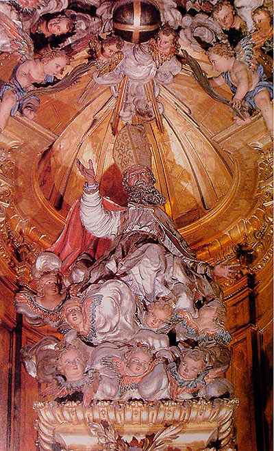Esta escultura rococó ocupa una hornacina a gran altura en el retablo en el lugar principal por ser el patrono de la iglesia. Realizada por Luis Salvador Carmona es un grupo de gran monumentalidad que representa la glorificación del santo obispo de Tours. Todo el grupo reposa sobre una peana de nubes y siete cabecitas de ángeles de actitud dinámica. San Martín aparece en pie con los brazos en diagonal y la cabeza ladeada cubierta por la mitra mirando hacia el cielo. Lleva un alba blanca plateada quebrada en pliegues menudos, los bordes inferiores se despliegan sobre las nubes. Se cubre con una pesada capa pluvial roja que se abre por el gesto de los brazos. La expresión del rostro es muy viva: la mirada se dirige a la gloria a donde se eleva, con la boca entreabierta y las barbas se mueven en diagonal por la fuerza de la ascensión. Hay rasgos característicos como unas arrugas en la frente, pómulos salientes y, el rehundimiento de las mejillas.