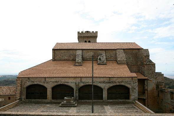 En torno al templo se sitúan una serie de dependencias, alguna de ellas en ruinas, que completaban el conjunto del santuario. Ubicadas junto al muro hastial de la iglesia, perpendicular al lado del Evangelio, se localizan las ruinas de una construcción rectangular de gran tamaño, dividida en dos espacios, ambos con sendas ventanas, y articulada en dos alturas, descansando el superior sobre arcos transversales cuyos arranques son todavía hoy visibles. Este espacio fue utilizado en el siglo XVIII como sacristía y en origen podría corresponder con el Estudio general empezado a construir por Carlos II entre 1378 y 1379. También en el muro del Evangelio, paralelo al mismo, se dispone un amplio espacio, denominado ‘claustro’, articulado por cuatro arcos rebajados sobre pilares y cubierto con armadura de madera apoyada en arbotantes. Se desconoce la función que cumplía, pudiendo haber sido construido en época de Blanca I (1385-1441). A la misma época o a la de su padre Carlos III (1361-1425) corresponde el espacio que envuelve la cabecera, cerrado por un muro en el que se disponen una chimenea y diferentes vanos con miradores góticos, lo cual atestigua su uso como residencia, lo que viene corroborado por la existencia de una letrina. Probablemente fue utilizado también como casa de la cofradía u hospedería. Finalmente, frente a la portada principal de la iglesia se sitúa una casa rectangular de varias alturas dividida en dos crujías mediante pilares superpuestos y cubierta por una estructura de madera. Presenta puerta de arco apuntado así como varias ventanas adinteladas sobre ménsulas. Este edificio fue utilizado a lo largo de la historia como casa del diezmo.