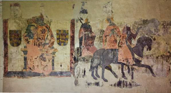 En el muro del Evangelio, y oculta tras la caja del órgano, se conserva una pintura mural de época gótica, pudiendo ser datada entre 1340 y 1359, según modelos del gótico lineal avanzado. En ella se representa, dentro de un marco rectangular, la figura de la Virgen con el Niño. María, sedente, situada en postura de tres cuartos, ladea la cabeza de rostro dulce contemplando a su hijo, a quien sujeta con la mano derecha mientras que con la izquierda sujeta un ramo de lirios, símbolo de su pureza. Por su parte, Jesús se sienta de perfil sobre el brazo derecho de su madre, agarrando con sus manos una mariposa. Encuadran al grupo sendos escudos de los López de Gurrea y, bajo uno de ellos, muy perdida, se percibe una figura, probablemente el donante, que se ha querido identificar con uno de los abades del monasterio de Montearagón pertenecientes a dicha familia, Jimeno (1327-1353) o Pedro (1353-1359). En la parte inferior hay una inscripción –“Martinet de Sangüesa fizo esta labor”– alusiva al autor de la obra. A la derecha de este grupo se sitúa una escena de la que tan solo se han conservado la representación de tres personajes a caballo que se dirigen hacia el lado contrario de donde esta la Virgen. Los tres jinetes, dispuestos en una superposición de planos, muestran diferentes actitudes de susto y sorpresa ante la figura que se situaría ante ellos y que se ha perdido. Esta escena se identifica con el Encuentro entre los tres vivos y los tres muertos, leyenda medieval que advertía sobre la fugacidad de la vida y la necesidad de preocuparse por la salvación del alma. Este tema vendría reforzado por el hecho de que Jesús sujete en sus manos una mariposa, símbolo de la resurrección del alma. Sobre esta escena se sitúa una inscripción parcialmente perdida e ilegible.