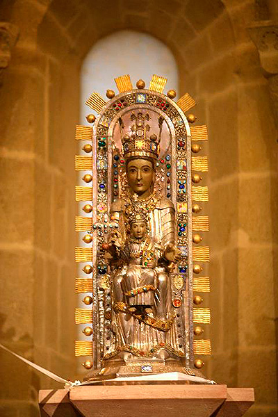La imagen titular del santuario, Nuestra Señora de Ujué, es una talla de madera forrada de chapas de plata datable en la segunda mitad del siglo XII. Responde al modelo de Sedes Sapientiae o Trono de la Sabiduría, en el que María sirve de trono a su hijo. Siguiendo la división entre este tipo de vírgenes en Navarra, deriva del grupo de Pamplona e Irache, con las que comparte además el recubrimiento de láminas de plata. Se trata de una imagen sedente, de gran hieratismo, en el que María mira al frente con los brazos doblados en ángulo recto en posición paralela, enmarcando, pero sin tocar, a Jesús, que se sienta en el regazo de su madre y mira también al frente, hacia el espectador, sin que haya contacto entre ambas figuras. Entre ellos no hay representación de vínculo afectivo, y la deshumanización con la que se representan enfatiza el hecho de que María sirve de trono no a su hijo, sino a la representación de la segunda de las personas divinas, que personifica la sabiduría. Adosados al trono en el que se sienta la Virgen se disponían cuatro relieves imitando sellos con las figuras del Pantocrator y la Virgen de Rocamador y seis escudos pintados en vidrio imitando esmaltes, cuatro con las armas de Francia y dos con las de Navarra, hoy en día reaprovechados en la nueva disposición. La imagen fue sometida a una amplia restauración en 1952, fecha de su coronación canónica, en la que se le añadió el respaldo de plata en su color y dorada, cuyo autor fue el orfebre madrileño Juan José García (1893-1962)