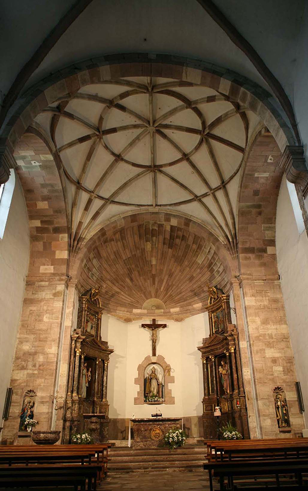 Por lo que respecta a la cubrición, el espacio central del crucero presenta una bóveda vaída que acoge una bóveda de tercelete realizada en piedra rosácea, en la que se inscriben dos círculos concéntricos en torno a la clave principal, mientras que los brazos cortos del mismo voltean con bóvedas de cañón pétreas. El presbiterio recibe una venera gallonada, labrada con la misma piedra rosácea, precedida por un estrecho arco de medio punto que apea sobre dos pilastras decoradas con motivos geométricos. Por su parte, la cubierta de la nave corresponde a la segunda mitad del siglo XVII, formada por dos tramos de bóvedas de arista de tosca ejecución separadas por arcos fajones que descansan en ménsulas adosadas a la parte superior de los muros.