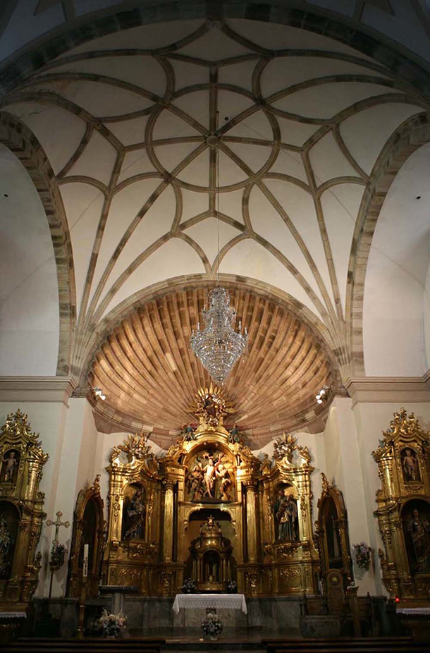 El templo sigue la tipología de planta de cruz latina, compuesta por una nave de cuatro tramos, crucero poco saliente y cabecera poligonal de cinco lados, a la que se unen por el lado de la Epístola la torre y la sacristía, y el coro alto a los pies. El interior del edificio, de muros enlucidos, carece de unidad formal, como se aprecia en el sistema de abovedamiento, correspondiendo a la época renacentista la pétrea concha avenerada decorada con gallones que cubre la cabecera, de sillar rosáceo, así como el crucero sobre el que voltea una bóveda vaída decorada con nervios terceletes, enlazados con otras nervaturas que dibujan una cruz de cuatro puntas, de diseño cóncavo-convexo, que terminan en patas de gallo, y en torno a cuya clave polar se inscribe un círculo. Al Barroco corresponden las bóvedas de cañón con lunetos de la nave, decorada con labores geométricas en yeso, estructurada por arcos fajones que descansan en una moldurada cornisa sobre placas recortadas que recorre todo el perímetro de la iglesia, confiriendo cierta uniformidad al interior.